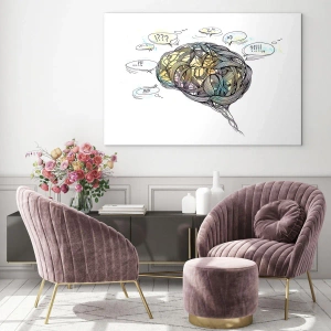 The speech bubbles around the brain symbolize the various thoughts, ideas, and emotions that accompany us every day. Colorful accents enliven the whole, giving the painting a modern and inspiring character. This work of art combines the simplicity of form with the depth of message, thanks to which it fits perfectly into modern interiors.