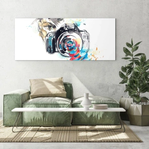 "In the Eye of the Lens" is a modern glass picture that depicts a camera surrounded by abstract, colorful elements. This artistic composition, full of dynamics and creativity, delights with its clarity and originality. It's the perfect decoration for anyone who loves photography and contemporary art.