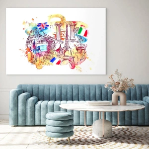 Glass picture - Watercolor of European monuments with country flags - 70x50cm - European Tour - Modern wall decoration for the living room and bedroom ARTTOR