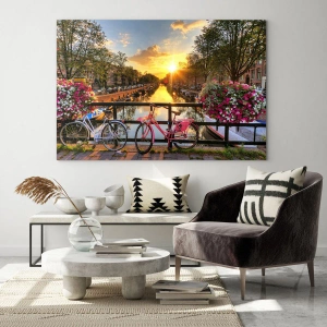 - A sunset over an Amsterdam canal, with bicycles and beautiful flowers in the background. A perfect decoration for interiors inspired by the city, nature, and tranquility.