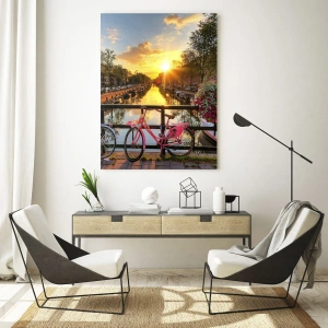 This 70x50 cm glass art print, titled "Spring morning in Amsterdam", depicts a sunset over a picturesque canal in Amsterdam, with two bicycles decorated with colorful flowers visible in the background. The scene, captured in the warm colors of the setting sun, creates an extraordinary atmosphere of peace and reflection. The golden hues of the sky reflecting in the water and the vegetation around the canal create a natural atmosphere that soothes and inspires.