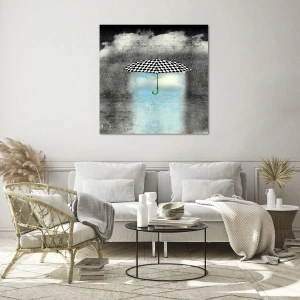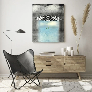 Glass picture - A black and white checkered umbrella against a background of rain and clouds - 70x50cm - And Yet It Is Possible - Modern wall decoration for the living room and bedroom ARTTOR