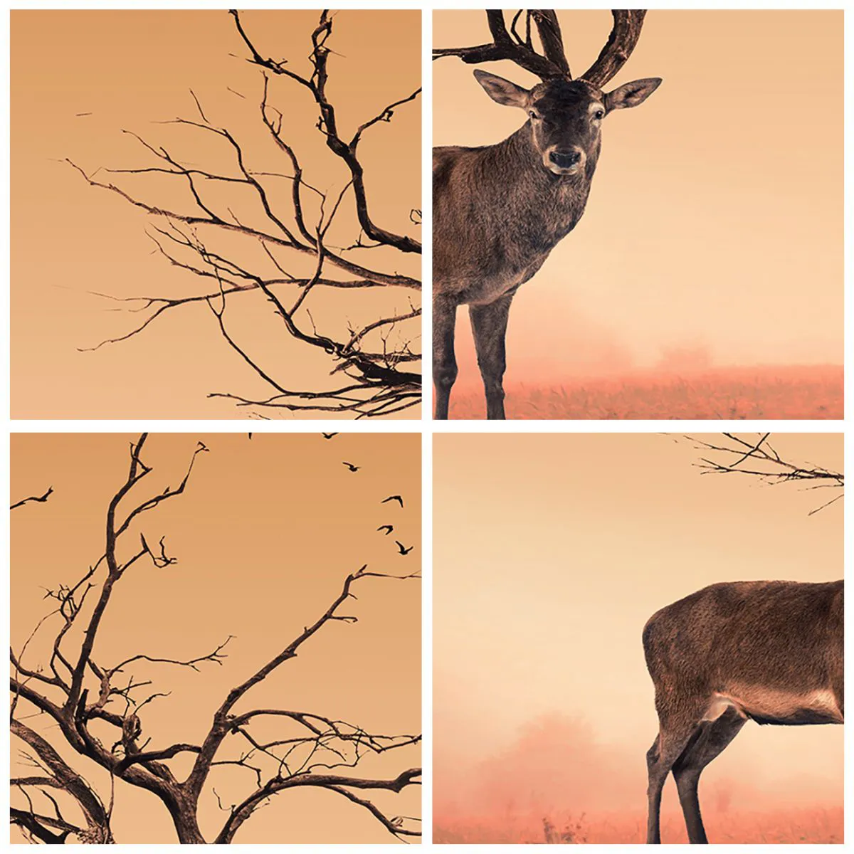 The deer's branches, which stretch against a background of warm colors, are a combination of wild fauna and vegetation. The birds complement the composition, symbolizing freedom and movement in this natural setting.