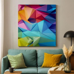 The "Colorful Geometric Abstraction in Vibrant Colors" painting is a work that attracts attention with its energy and modern design. The main element of the composition is geometric patterns, based on colorful triangles in intense colors such as blue, yellow, pink, or orange. This dynamic combination of colors and shapes brings energy and creativity to the interior, giving the space a unique character.