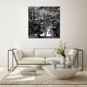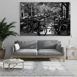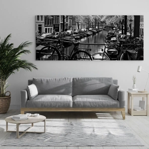Glass picture - Black and white view of a canal with bicycles and boats - 70x50cm - A Very Dutch View - Modern wall decoration for the living room and bedroom ARTTOR