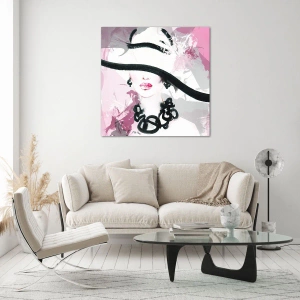 Glass picture - Portrait of a woman in a black hat with a pink background - 70x50cm - Portrait of a Lady in Black and Pink - Modern wall decoration for the living room and bedroom ARTTOR