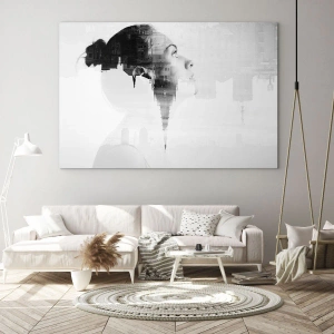 The silhouette of a woman artistically combined with elements of urban architecture is a work that attracts the eye with its uniqueness. The painting is distinguished by its minimalist style and contrasting colors, which emphasize its modern character.