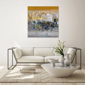 This glass art print depicting an artistic abstraction in shades of gold, silver, and gray is a unique decoration that brings harmony, elegance, and a modern artistic expression to your interior. Subtle color transitions and a distinctive texture create a composition full of depth and unique character.