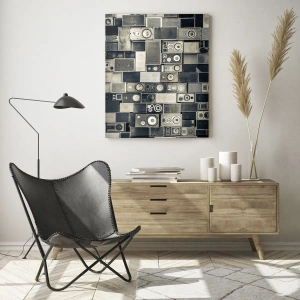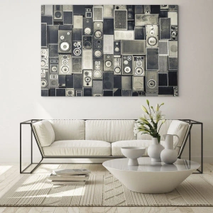 "And Everything Plays" is a unique 70x50 cm glass picture depicting a composition of various retro speakers. Monochromatic shades of gray give the whole thing an industrial character that perfectly suits vintage or modern interiors.