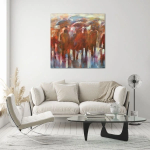 This painting is an excellent choice for those who appreciate modern art that inspires and attracts attention. The artistic abstraction of a crowd with umbrellas is a unique decorative accent that will surely enhance any interior.