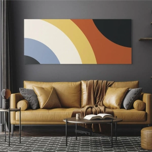 "Towards Yourself" is a glass art print that catches the eye with its unique, abstract pattern. The decoration features colorful arches in shades of yellow, blue, black, and orange, creating a balanced composition. The geometric nature of the pattern fits perfectly into a modern style, while adding an artistic expression to interiors.