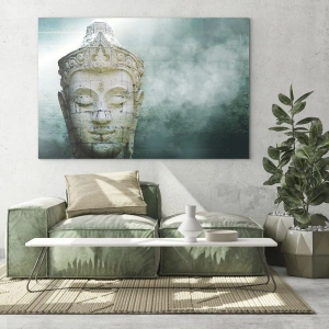 The green background of the painting refers to nature, emphasizing its closeness and balance. The delicate details of the Buddha statue add elegance, creating a sophisticated decoration that perfectly complements oriental interior design.