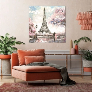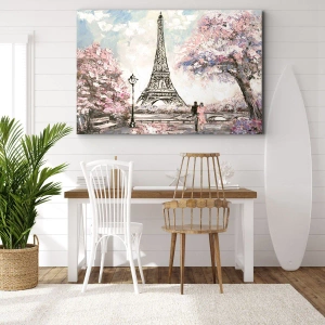 The canvas is stretched over the frame. The sides and edges of the picture are printed to form a continuation of the image. The painting is ready to hang on the wall. Each product comes with a hanger attached to the frame and a mounting kit (screw + wall plug).