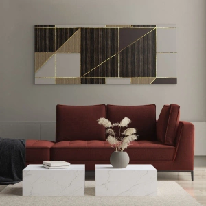 This horizontal 70x50 cm glass print fits perfectly into modern spaces such as living rooms, offices, or commercial spaces. The geometric pattern, dominated by gold and brown, is a subtle yet expressive decoration that adds elegance to any interior.