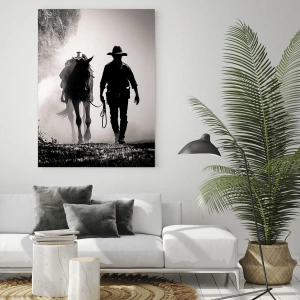 A cowboy leading a horse through a misty landscape is the main motif of the painting "Texas Morning". The black silhouette of the figure against the fog introduces us to the atmosphere of the Wild West. The black and white colors of the painting add a mysterious and timeless character. The painting perfectly captures the atmosphere of a western, full of peace and freedom.