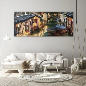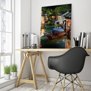 Glass picture - Chinese street at night with boats and lights along the canal - 70x50cm - Evening on a Chinese Street - Modern wall decoration for the living room and bedroom ARTTOR