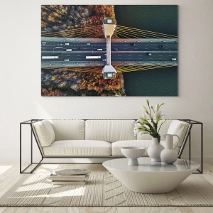 - Aerial view of a modern cable-stayed bridge with traffic and geometric symmetry. This ARTTOR glass print measures 70x50 cm in a horizontal format. Perfect for modern interiors.