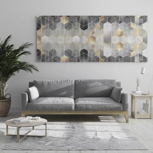 The use of geometric forms gives the painting a modern and timeless look. The hexagons, being the main motif, symbolize harmony, order, and balance. Combined with metallic gold, they bring a touch of elegance and prestige to the interior. The subtly shaded background is reminiscent of industrial finishes, further enhancing the effect of modernity and style.