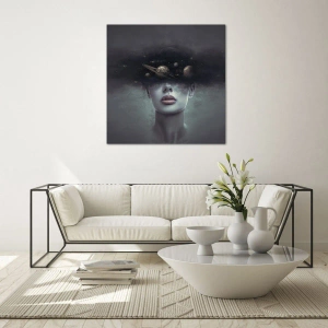 The applied surrealist style makes the painting work on many levels - both emotional and intellectual. The delicate face of the woman contrasts with the power and chaos of the cosmos, creating an extremely original and profound visual narrative. These types of compositions work particularly well in spaces designed to stimulate creativity and inspire thought – such as art studios, modern living rooms, or bedrooms with a unique character.