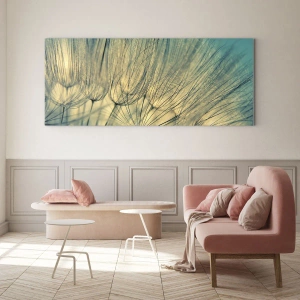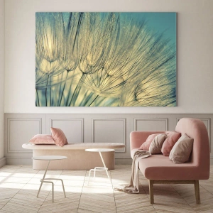 The painting Waiting for the wind shows the subtle beauty of nature captured in the form of macro photography. In the foreground, we see a dandelion in its full glory – its delicate fibers stretch in different directions, creating a light, almost ethereal structure. The turquoise background contrasts perfectly with the golden elements of the plant.