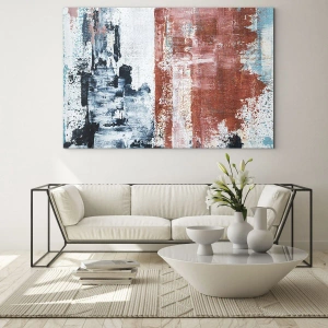 - dynamic abstract composition featuring a vertical division of the image into two contrasting blocks of color: blues and grays on one side, and warm reds and hues on the other. Perfect for modern interiors.