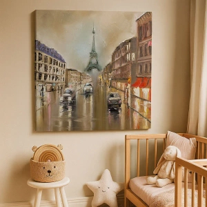 The canvas is stretched over the frame. The sides and edges of the picture are printed to form a continuation of the image. The painting is ready to hang on the wall. Each product comes with a hanger attached to the frame and a mounting kit (screw + wall plug).