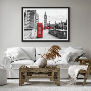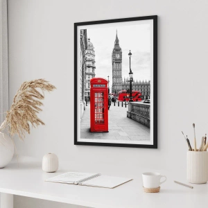 - The poster depicts London's iconic red telephone box, with Big Ben and a passing bus in the background. The dynamic juxtaposition of red against a monochromatic background enhances the urban atmosphere.