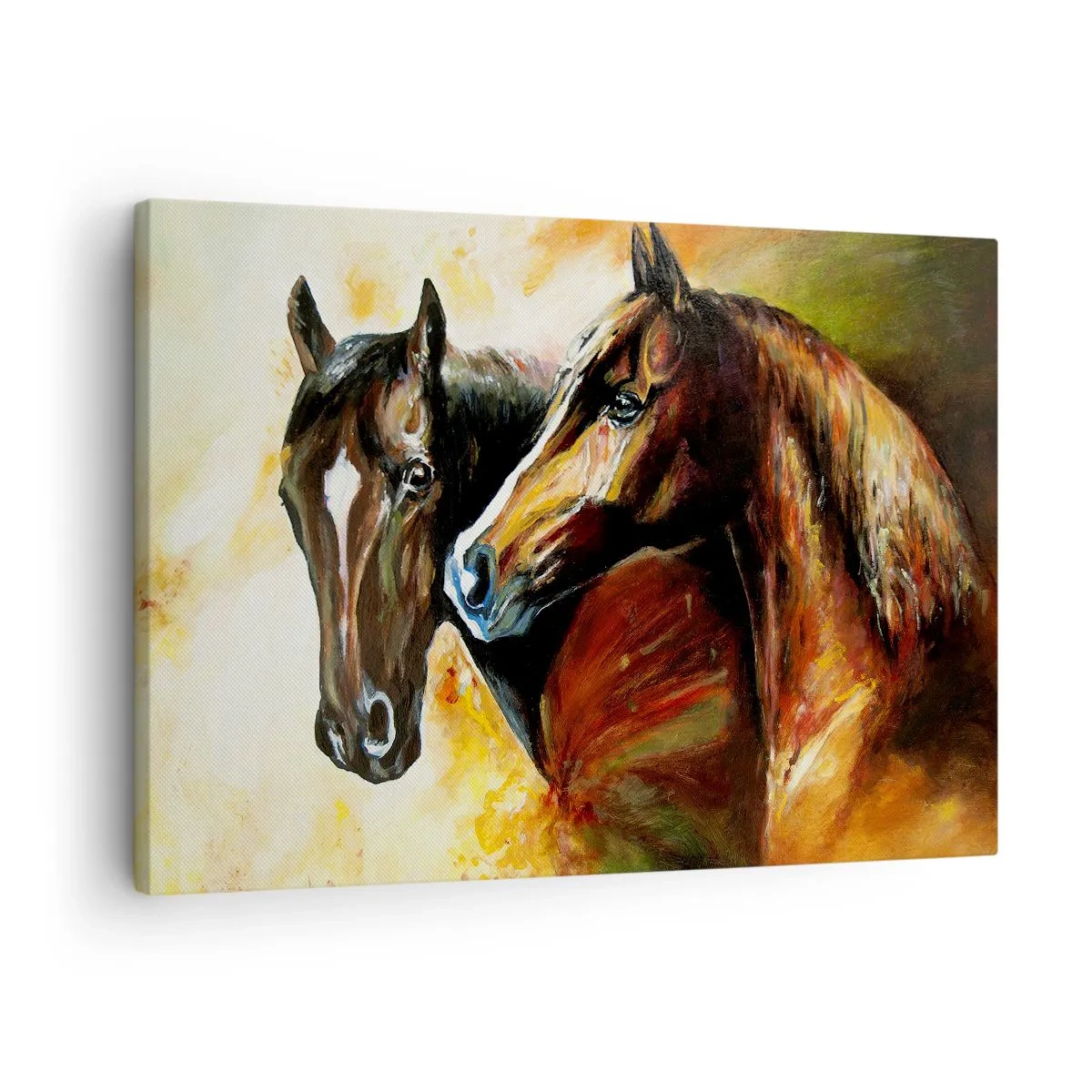 - The painting depicts a pair of horses in a painterly composition with warm color tones. Perfect for interiors that value the elegance and natural beauty of animals.