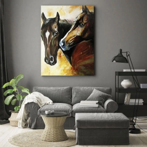 The painting "Pair of horses in a painterly composition" is a unique work of art that captures the beauty and harmony of nature. It depicts a pair of horses against a background of warm earthy tones, in a painterly aesthetic that emphasizes the grace and elegance of these animals. This work brings peace and natural harmony to the interior, creating a unique decorative element.