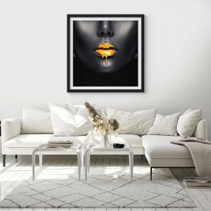 "Golden Lips" is a poster showing an artistic portrait of a woman with orange lip paint, depicted against a black face. This unique composition exudes sensuality and modern aesthetics, introducing a contrasting combination of black and orange.