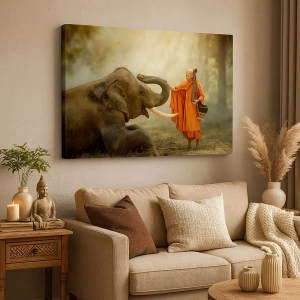 - The painting depicts a monk and an elephant in a harmonious moment against a natural backdrop. Perfect for interiors that value a spiritual atmosphere and closeness to nature.