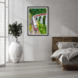 The poster depicts a picturesque landscape in which a red train glides along a majestic viaduct, surrounded by a lush, green forest. The image captivates with its harmony and contrast between architecture and nature, inviting the viewer on a journey full of inspiration.