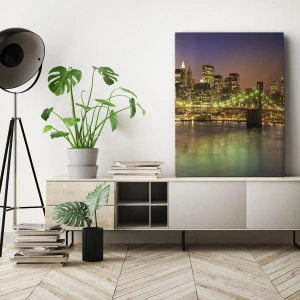Here the light never goes out is a canvas print that captivates with its modern atmosphere and elegance. It depicts an illuminated bridge stretching over a river, with the panorama of the city full of lights in the background. The composition captures the extraordinary charm of a metropolis at night, where the interplay of light and shadow creates a unique atmosphere. Reflections of light reflecting off the water surface give the image depth and harmony, introducing the atmosphere of a big city to the interior.