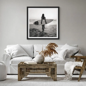 - This poster depicts a woman with a surfboard on a beach at sunset. This black-and-white design is perfect for elegant and modern interiors. The set includes a black frame measuring 50x70 cm.