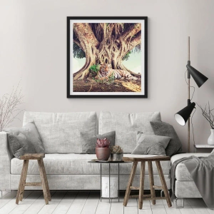 "View from the Book of Genesis" is a unique poster showing a tiger resting in the shade of a mighty tree. The intertwined roots and spreading branches create a fascinating backdrop for the animal's majestic silhouette. The combination of wild nature and the tiger's royal demeanor makes the composition eye-catching and adds an exotic atmosphere to the interior.