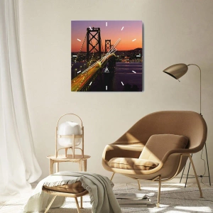 - The motif of a bridge illuminated by lights against a setting sun emphasizes elegance and modernity. The clock is a perfect fit for interiors inspired by cities and architecture.