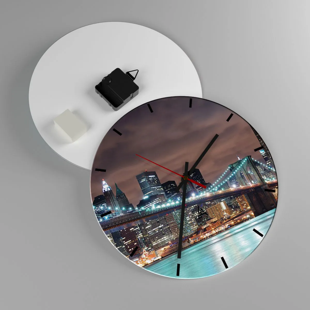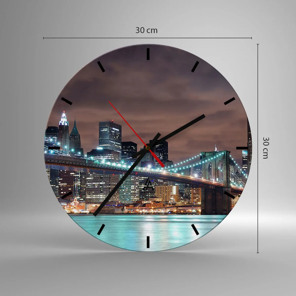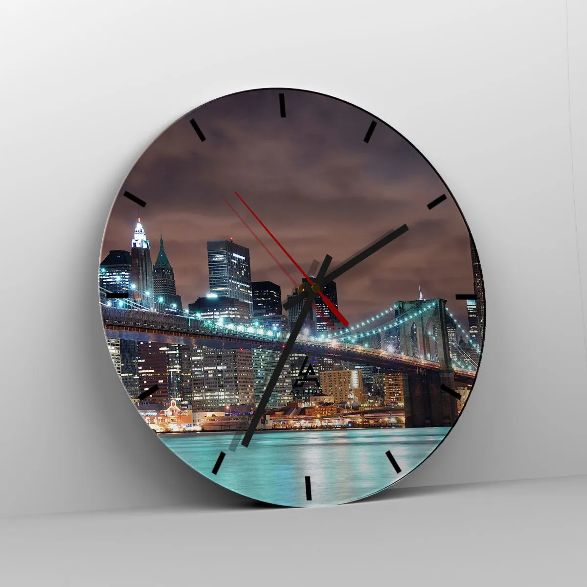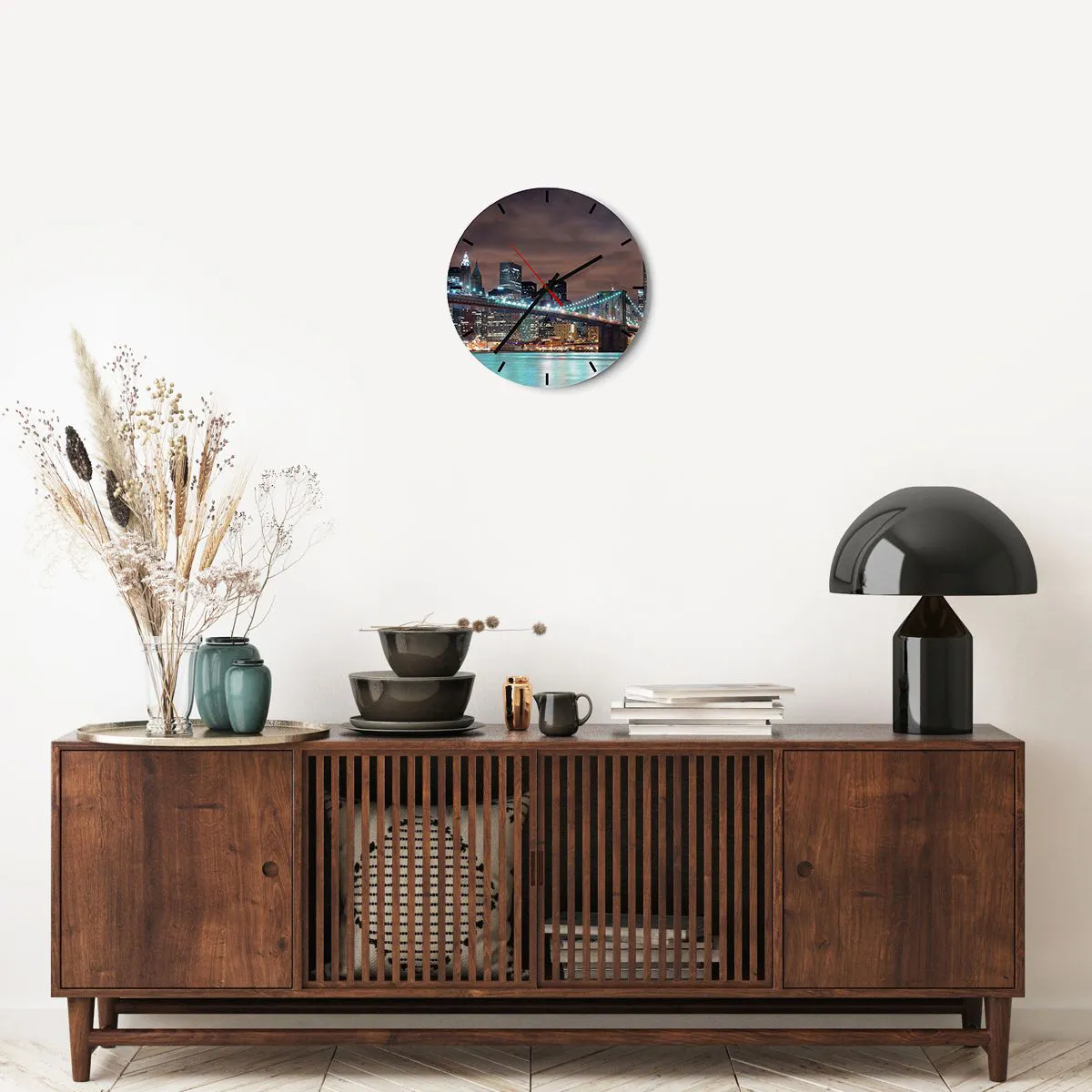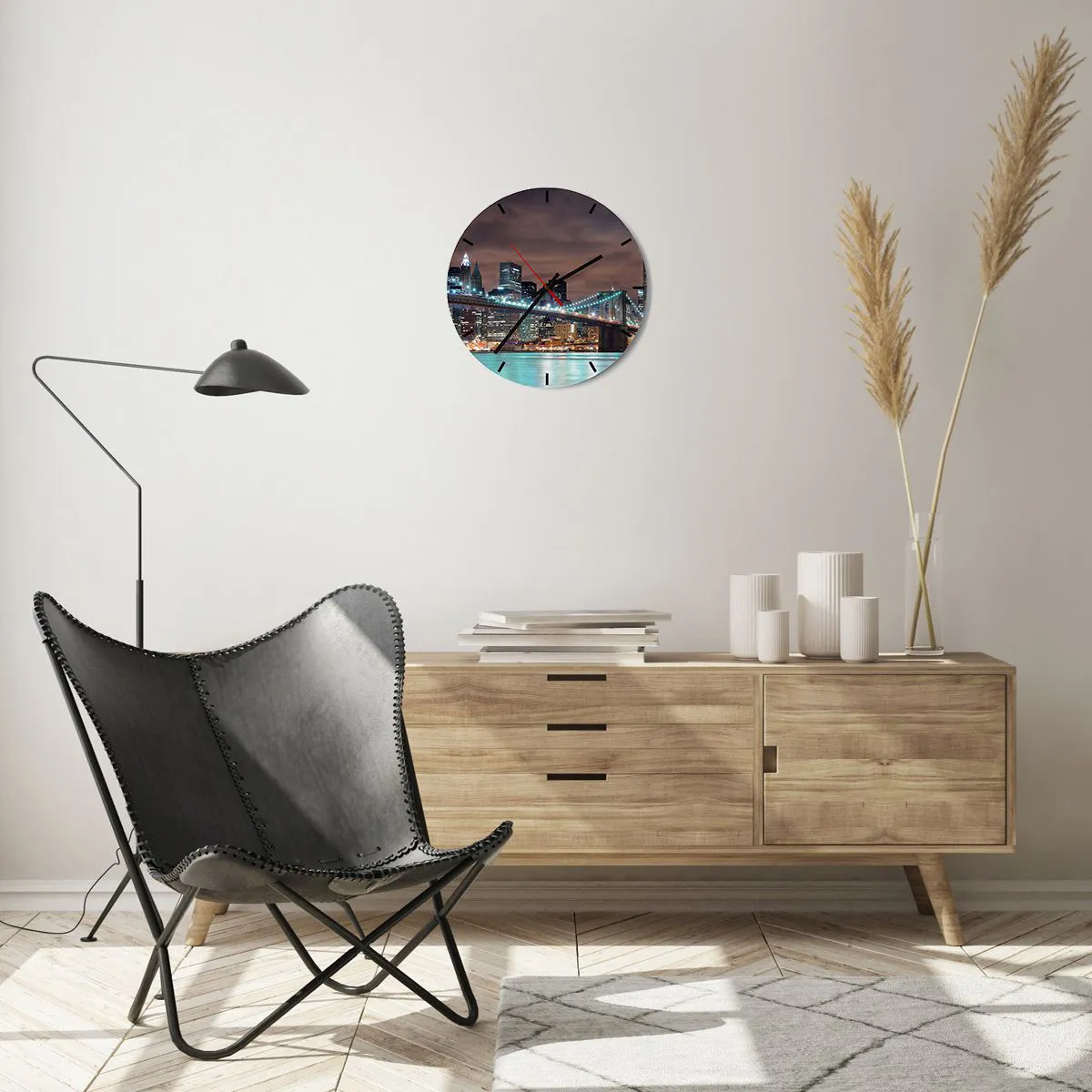 - This round wall clock features an image of the Brooklyn Bridge and the New York skyline at night. Perfect for modern interiors, it adds elegance and an urban vibe. The 30x30 cm format is crafted from glass.