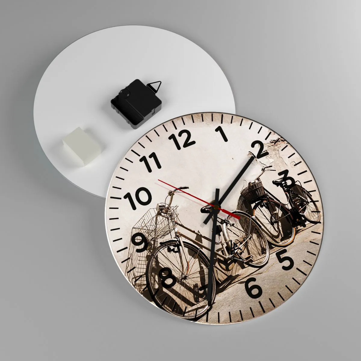 The clock is made of 4mm thick, safe glass. The clock's manufacturing technology complies with safety class 2B2 according to the PN-EN 12600:2004 standard, which guarantees impact resistance. The glass clock is ready to hang - it has a metal hanger attached to the back and a foam pad to regulate the even spacing of the clock from the wall. The clock has a silent mechanism powered by a 1.5V - AA battery (battery is not included).