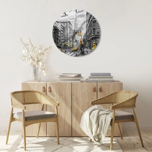 The "New York Story" wall clock is a unique decorative element that transports us to the crowded streets of New York. The clock face is decorated with an artistic graphic depicting the characteristic urban landscape with yellow taxis against the background of gray skyscrapers. It's the perfect choice for lovers of the metropolitan atmosphere and original interior accessories.