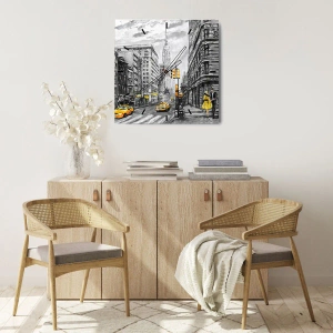 The gray and yellow colors create a contrasting composition that gives the clock a distinctive and unique character. Every detail of the image, from the architectural accents to the dynamic street traffic, emphasizes the artistic quality of this decoration. It's the perfect design element for those who value modern and industrial style.