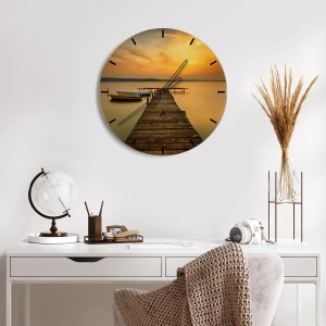 Wall clock - Clock on glass - A wooden jetty on a lake at sunset with a boat in the background - 30x30cm - I Will Open up Golden Sky before You - Modern wall decoration for the living room, kitchen, and bedroom ARTTOR