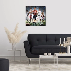 The motif of athletes representing various disciplines, such as football, basketball, or baseball, symbolizes the diversity and universality of sport. The stadium backdrop illuminated by spotlights creates an extraordinary atmosphere that recalls moments of triumph and adrenaline associated with sports competitions. The use of intense colors and dynamic shapes emphasizes the energy and emotions that sport brings.