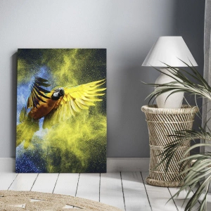 In Blue and Gold Dust is a canvas print that depicts a dynamic view of a parrot in flight against a colorful explosion of yellow and blue. This exotic composition, full of energy and harmony, brings a unique character and expressiveness to the interior.