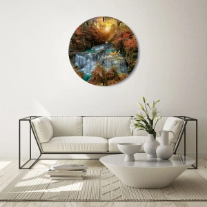 - This wall clock, made of durable glass with a round face, is decorated with a picturesque autumn landscape with a waterfall in the light of the setting sun. Perfect for interiors that evoke the harmony of nature.
