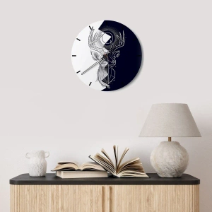 Wall Clock "Fight and Unity of Opposites" is a unique decorative element that delights with its geometric design and minimalist character. The clock face features a geometric deer motif, placed against a contrasting background of white and black. This unique design adds elegance and artistic expression to the interior.