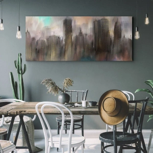 Composition of Steel, Stone, and Fog is a canvas painting that depicts a subtle and artistic urban landscape with skyscrapers in pastel shades. This unique composition brings an atmospheric and inspiring accent to any interior.