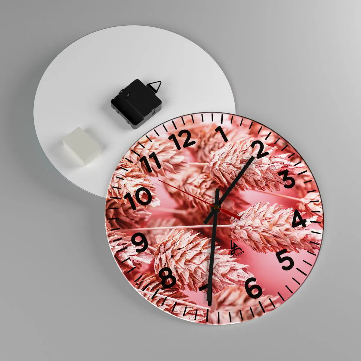 The clock is made of 4mm thick, safe glass. The clock's manufacturing technology complies with safety class 2B2 according to the PN-EN 12600:2004 standard, which guarantees impact resistance. The glass clock is ready to hang - it has a metal hanger attached to the back and a foam pad to regulate the even spacing of the clock from the wall. The clock has a silent mechanism powered by a 1.5V - AA battery (battery is not included).
