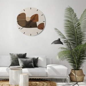 - This round wall clock features abstract shapes in shades of brown on a beige background. A modern and minimalist addition to elegant interiors.
