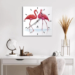Wall clock - Clock on glass - Two pink flamingos standing in the water - 30x30cm - Pink Rendezvous - Modern wall decoration for the living room, kitchen, and bedroom ARTTOR