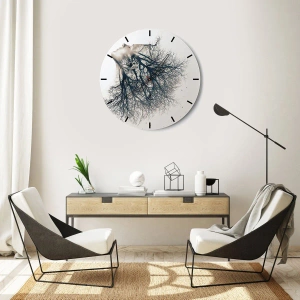 Made of glass in a round format, measuring 30x30 cm, this clock combines durability with aesthetic design. Black hour markers and contrasting red hands add functionality while emphasizing the artistic character of the image.